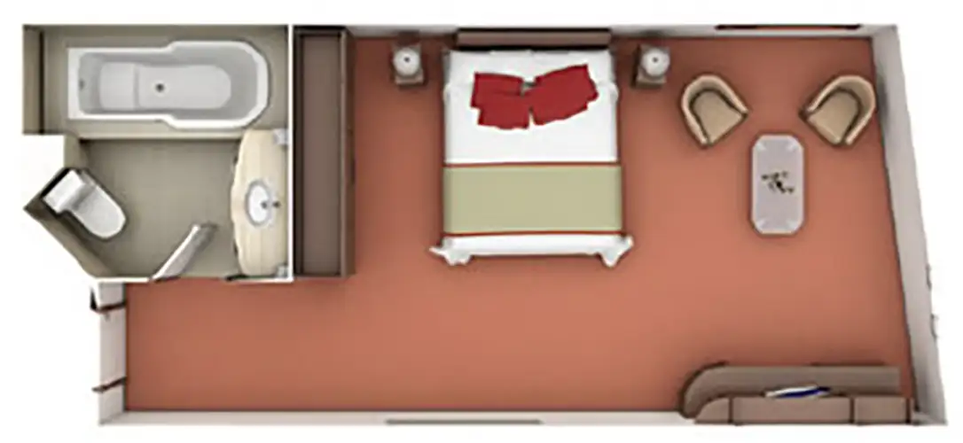 14-15 m2 with two portholes. Living room. Two single beds or queen size double bed. Marble bathroom with tub and shower combination. Desk. Flat screen TV with interactive video, movies and music on demand, and satellite news programming. Telephone.