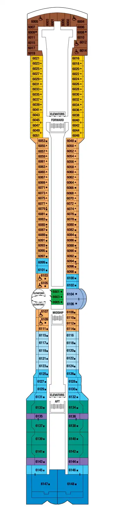 The Ultra Deluxe Concierge Class Staterooms (UC) deliver an enhanced cruising experience, combining generous space with exclusive privileges. Each stateroom features about 209 square feet of interior area and a private veranda of approximately 42 square feet, creating an ideal retreat for rest and relaxation. Located aft on Deck 6, they offer both privacy and breathtaking views; with only four available, securing your booking early is highly recommended.